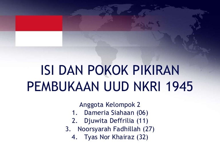 Pokok pikiran pertama. Pokok-pokok pikiran yang terkandung dalam Pembukaan UUD 1945 merupakan perwujudan dari sila-sila dalam Pancasila. Berikut ini empat penjelasan tentang pokok pikiran yang terkandung didalam pembukaan Undang-Undang Dasar 1945 yaitu. Media pembelajaran PPKn KD. Negara begitu bunyinya-yang melindungi segenap bangsa Indonesia dan seluruh tumpah darah Indonesia dengan berdasar atas persatuan dengan.